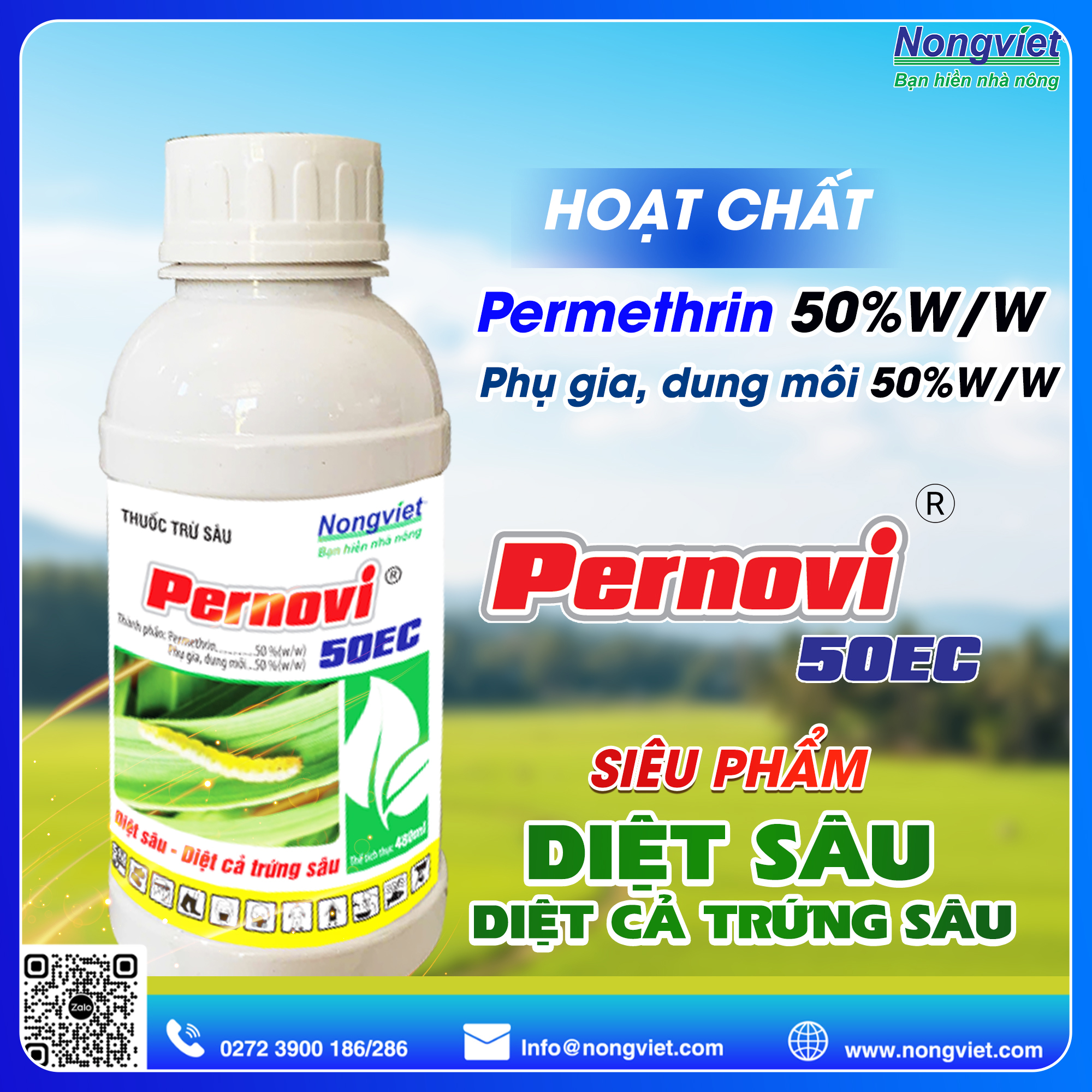 Hoạt chất Permethrin 50% trong PERNOVI 50EC tác động trực tiếp lên hệ thần kinh côn trùng, làm chúng tê liệt và chết nhanh, đồng thời hiệu quả trên nhiều đối tượng như sâu cuốn lá, bọ trĩ, ruồi đục quả, sâu xanh da láng…