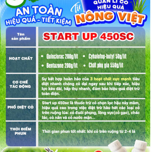 Start up 450sc là thuốc trừ cỏ chọn lọc hậu nay mầm, hiệu qua cao trong việc diệt trừ hau hết các loại cỏ trên ruộng lúa: có đuôi phụng, lồng vực(có gạo), chác lác, cỏ năn và co nước mặn …