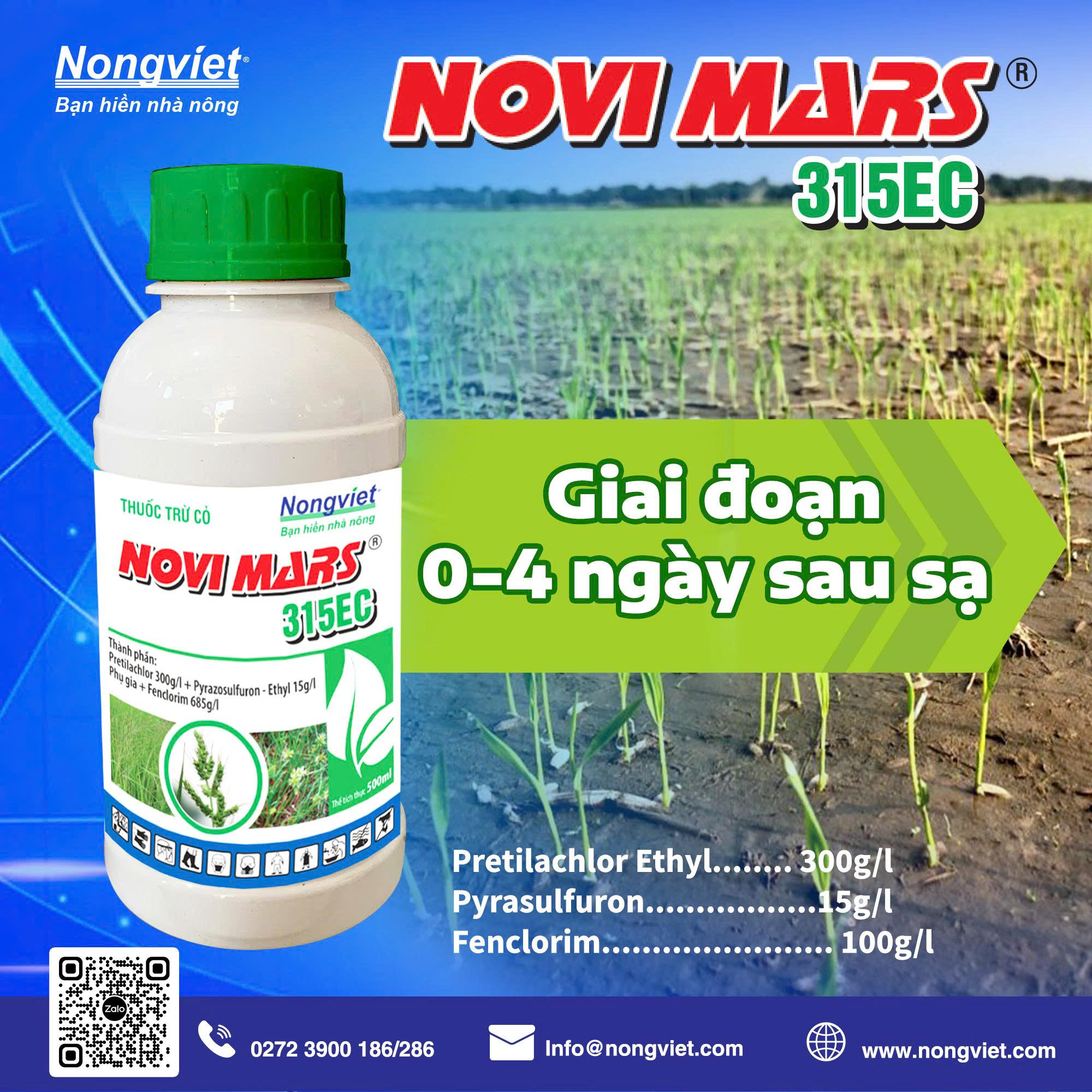 - Cách sử dụng: Pha hỗn hợp NOVIMARS, NOVIPHOS và VISILON rồi phun đều trên mặt ruộng ngay sau khi sạ 0-4 ngày. Cần giữ mực nước ruộng nông để thuốc phát huy tác dụng tốt nhất.